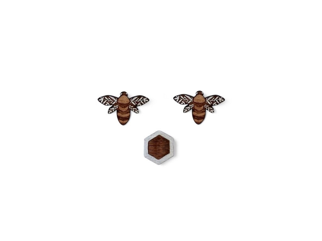 Dvě dřevěné včely s jemnou kresbou květů na křídlech doplňuje ještě jedna náušnice ve tvaru medové plástve. Tu můžete použít do třetí ušní dírky, ale klidně i jako mini brož do klopy saka nebo límečku košile. A nebo si dáte do jednoho ucha včelu a do druhého plástev? Tyhle originální a kreativní náušnice vás prostě budou bavit!