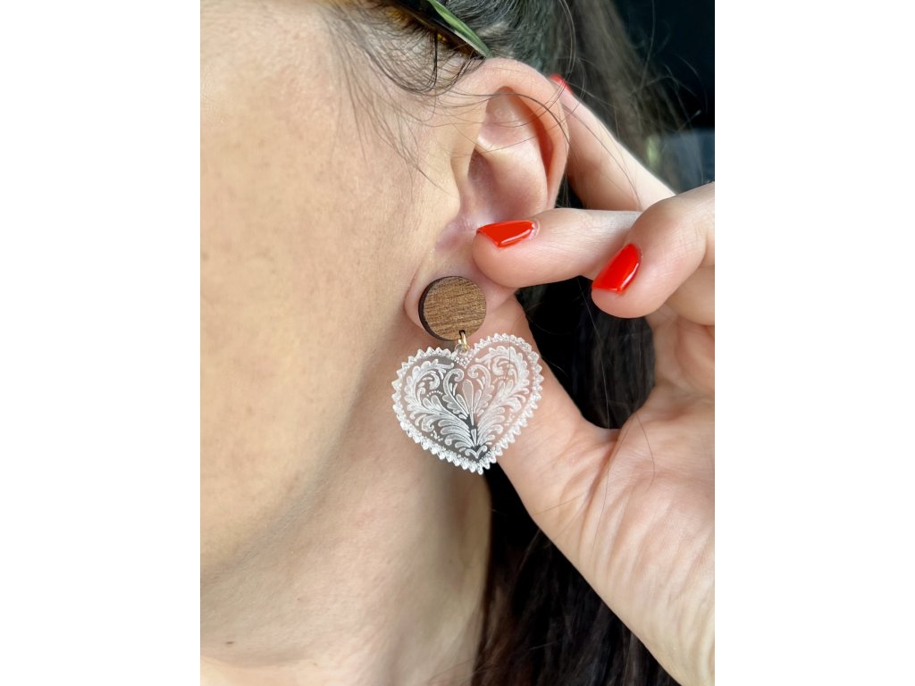 Srdce z plexiskla s folklorními motivy má připomínat tradiční krajkové aplikace, ale zároveň je tahle forma mnohem současnější a odlehčenější. Náušnice můžete skvěle zkombinovat s džínovou nebo koženou bundičkou, ale budou vypadat skvěle i s romantickými letními šaty.