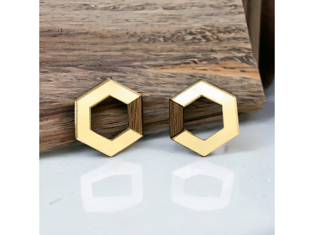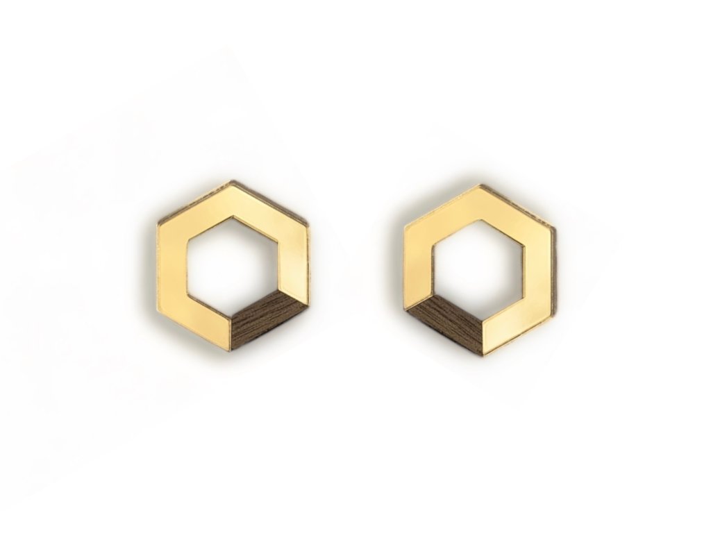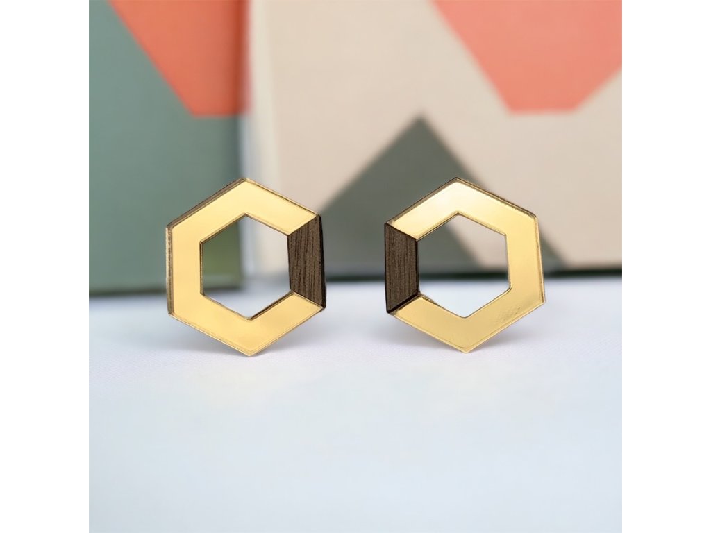 Náušnice v originální kkombinaci zlatého zrcadlového plexiskla a ořechu.