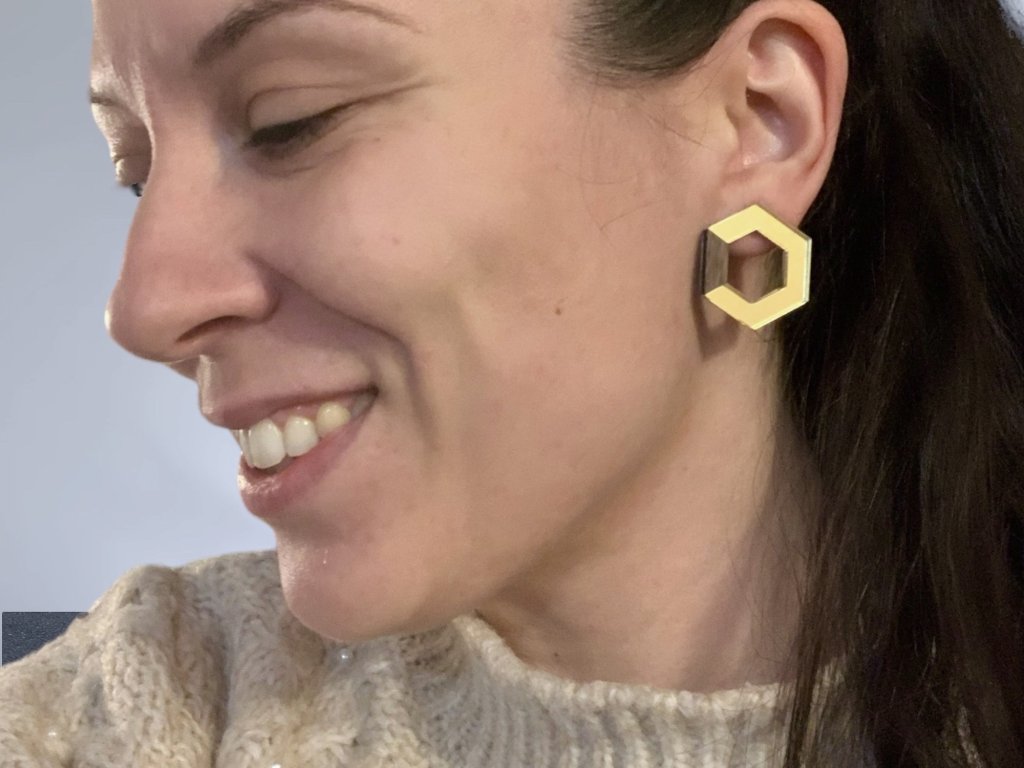 Náušnice ze zlatého zrcadlového plexiskla a ořechového dřeva jsou výrazné a nápadné, ale přesto v minimalistickém stylu.