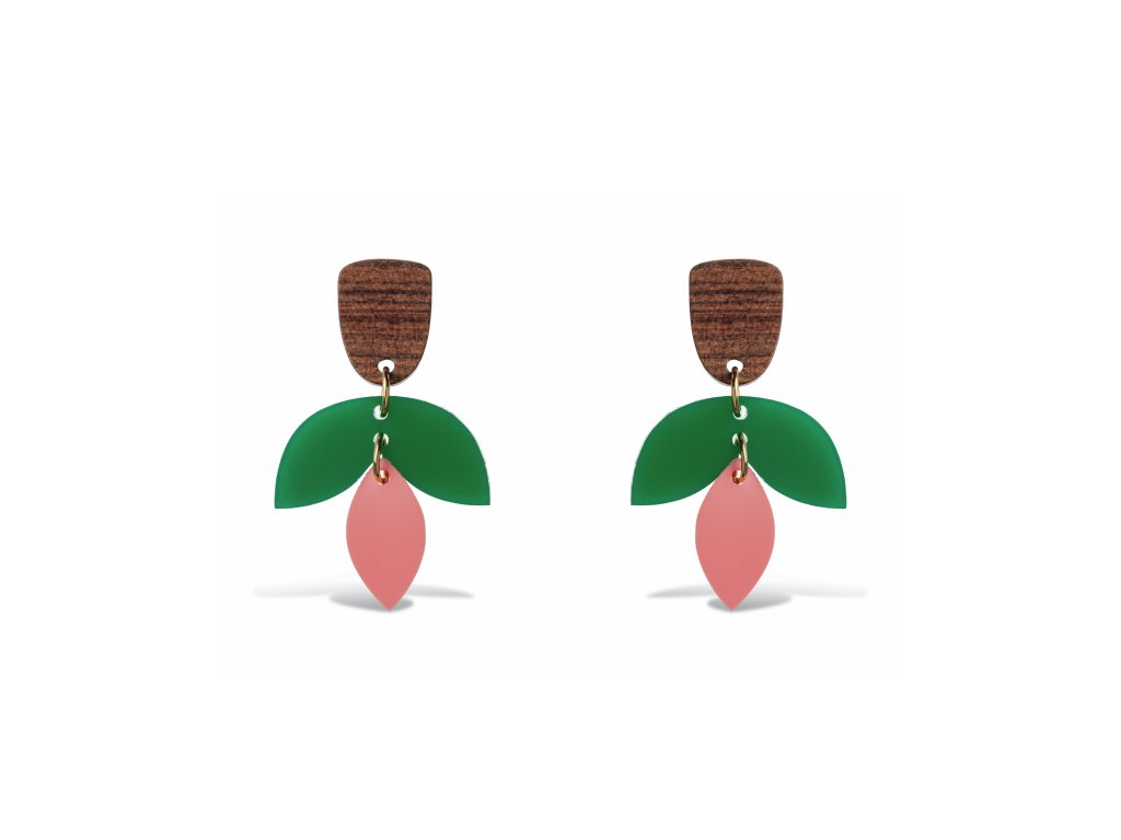 Výrazné náušnice s lehkým nádechem retra kombinují ořechové dřevo a lístky ze zeleného a pastelově růžového plexiskla.