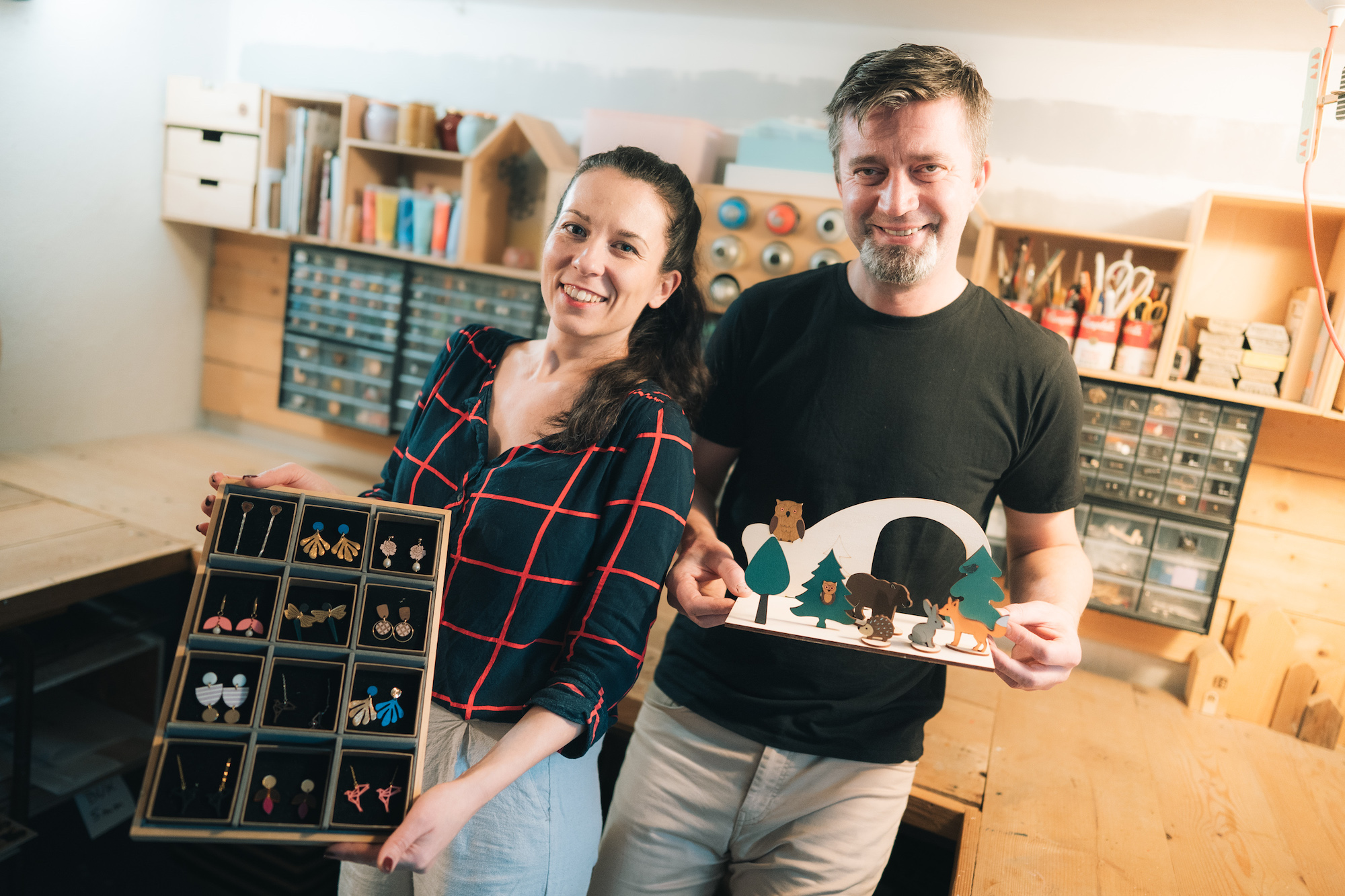 Dřevěné šperky, hračky a dekorace vyrábíme v rodinné dílně v Lounech už od roku 2019. Záleží nám nejen na tom, aby byly hezké a originální, ale chceme také, aby něco vydržely. Dřevěná brož na kabátu se nesmí rozmazat, když vás někde chytne déšť. Kovová puzetka se nesmí odlepit od náušnice, když si přetáhnete svetr přes hlavu. Proto všechny typy našich šperků vyvíjíme s ohledem na design i funkčnost.